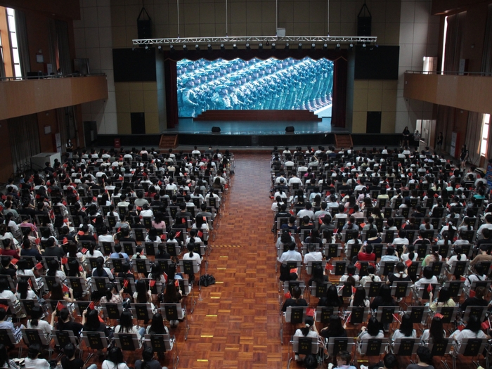 阅兵式上,受阅部队以威武雄壮的强大阵容、昂扬奋进的崭新风貌、一往无前的磅礴气势接受党和人民的检阅。整齐划一的徒步方队、威武先进的装备方队、翱翔天际的空中梯队依次通过天安门广场,场面震撼人心。师生们全神贯注地观看,被庄严的氛围所感染,不时爆发出阵阵热烈的掌声。